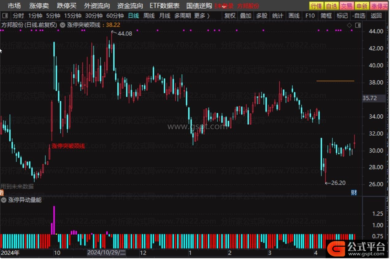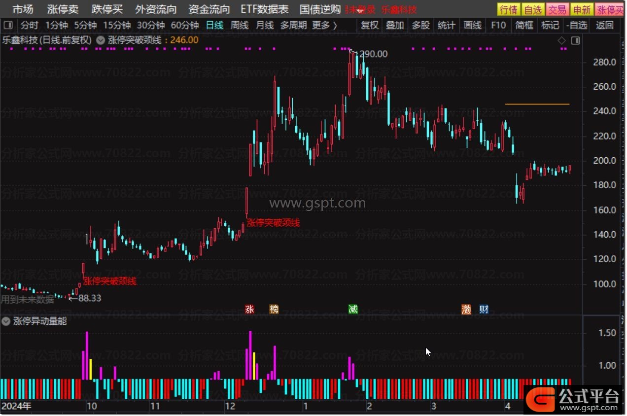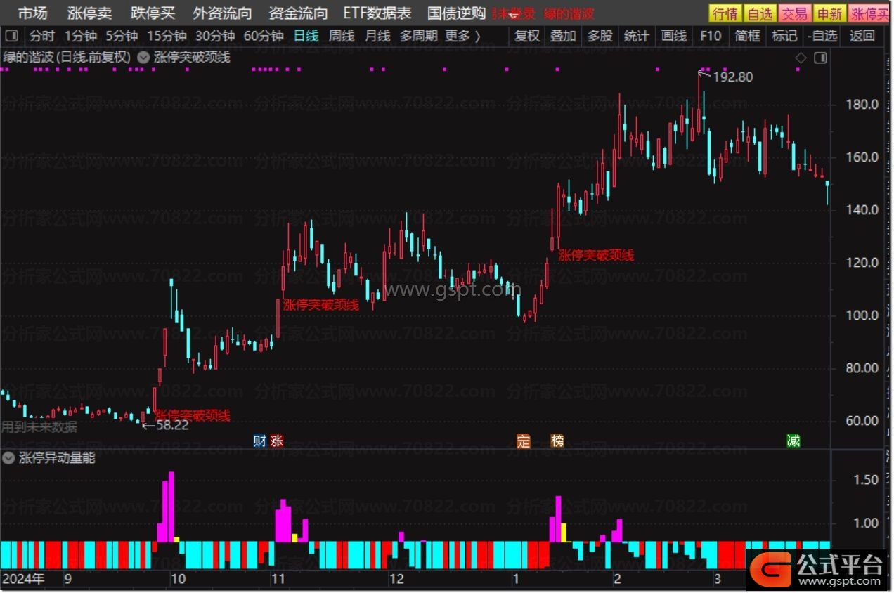 DRAWTEXT(XG, LOW*0.98, '涨停突破颈线'), COLORRED;