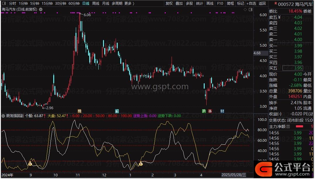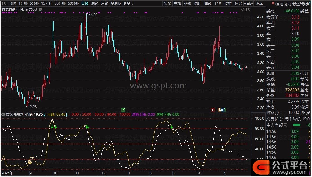 “震荡强弱”指标,是程峰在《稳操胜券》中首创的副图指标,包含选股功能且无未来函数。它基于震荡型指标KD的D值原理,融合大盘指数的KD指标D值曲线。图中,黄线为大盘D值,白线为个股D值,均在0-100区间波动,分析规则与KD指标一致:20以下为超卖区,50为强弱分界线,80以上为超买区。该指标将黄白两线置于同一坐标系,形成震荡型强弱对比,经典且具实战价值。