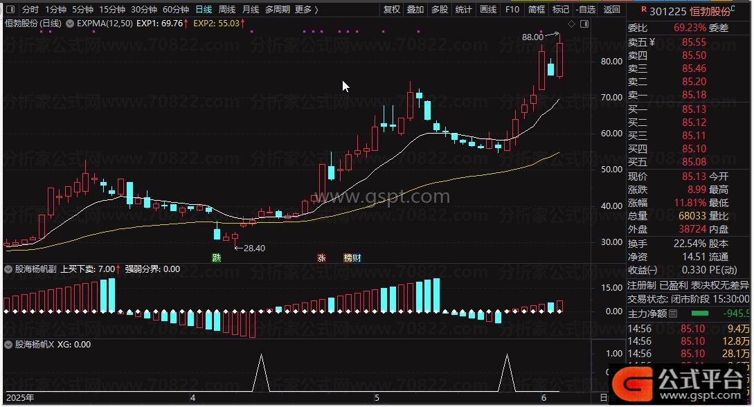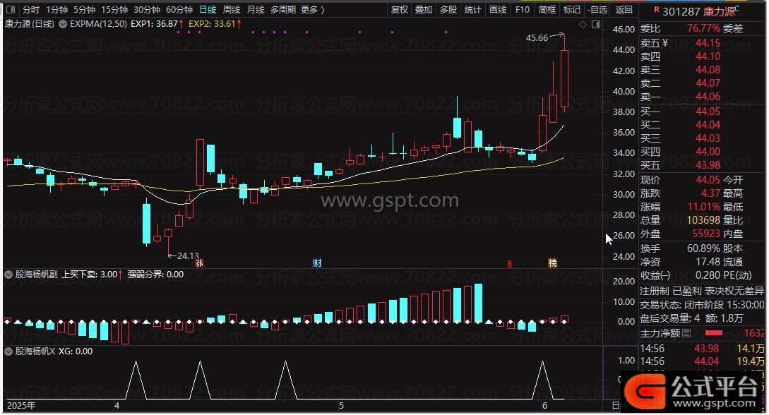 股海杨帆指标主要由红、绿两色柱线以及“强弱分界”线共同构成,形态似风帆。借助股海杨帆指标,股市涨跌态势能够一目了然呈现。