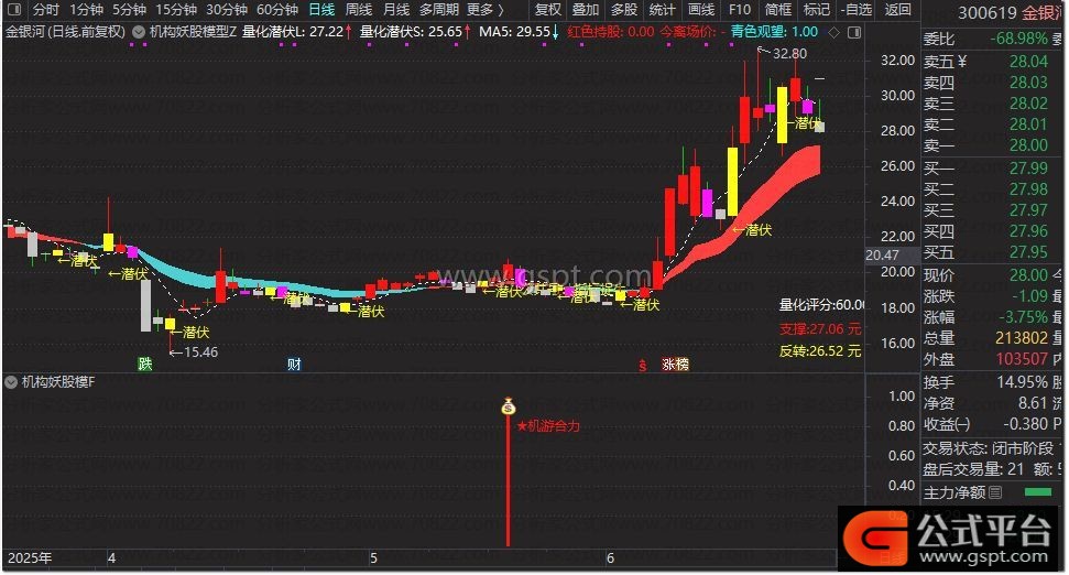 量化潜伏S:DMA(EMA(GSPT,20),MAX(1,100*(SUM(VOL,5)/(3*CAPITAL)))),COLORWHITE,DOTLINE;