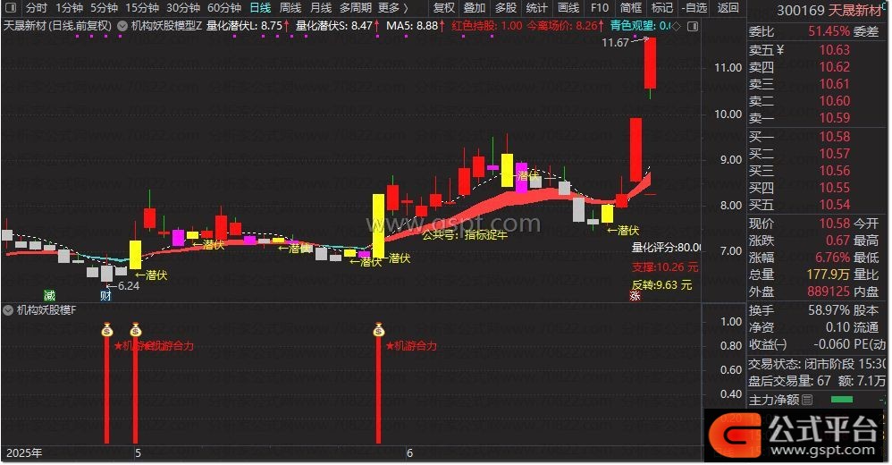 量化潜伏L:(EMA(GSPT,10)*7+EMA(GSPT,20)*3)/10;