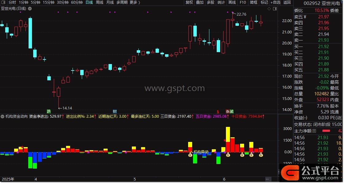 当黄柱初出蓝时,显示紫色五角星标识;长黄柱时,显示红色五角星标识。若单日资金净流入突破且伴随价格突破关键均线,生成“机构异动”信号标识,提示机构集中建仓行为,为投资者提供决策参考。
