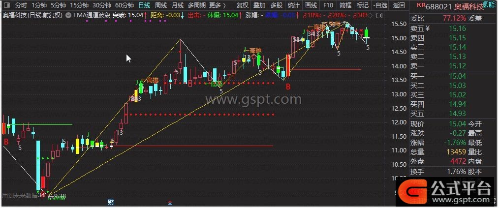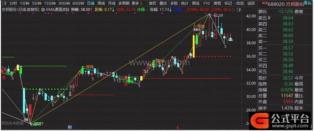 出击:IF(分析家公式网>=0,REF(EMA(C,14),BARSLAST(CROSS(分析家公式网,0))+1),DRAWNULL)COLORRED,LINETHICK1;