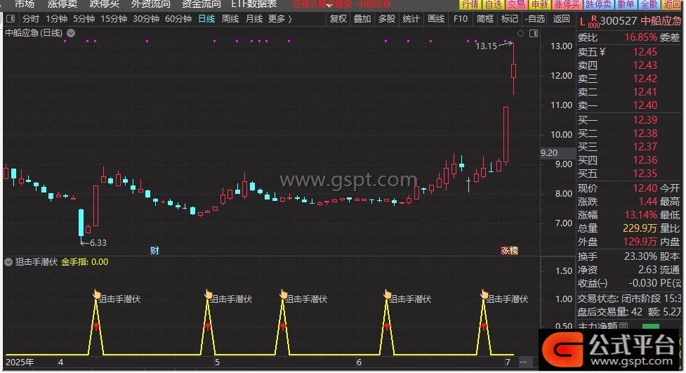 3. **金手指条件**:综合前面所有条件,当满足特定形态时,标记为“狙击手潜伏”,提示可能的涨停机会。符合条件时,公式会在图表上绘制黄色粗线,并显示“狙击手潜伏”文字及图标,帮助投资者快速识别潜在机会。