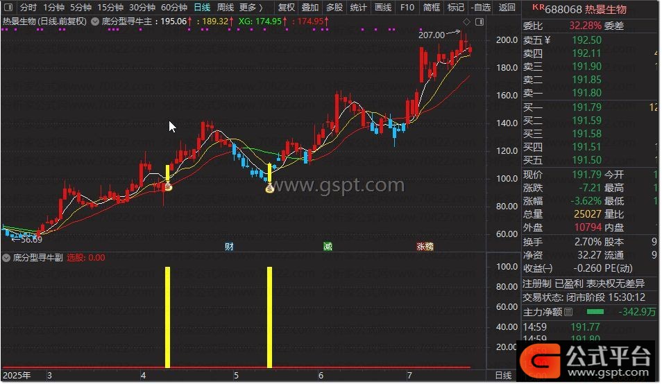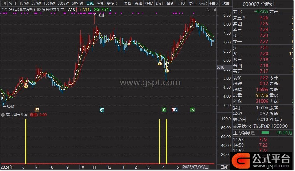 该指标聚焦股价底部区域,较少上升途中触发,提高抄底准确性。核心条件包括:5日均线上穿10日均线形成金叉,底分型形态中第三根K线需放量,收盘价站稳5日均线。当底分型确认,同时满足均线金叉与K线站上5日线条件时,结合MACD多头发散信号,可视为入场时机。若股价跌破10日均线,建议减仓离场。