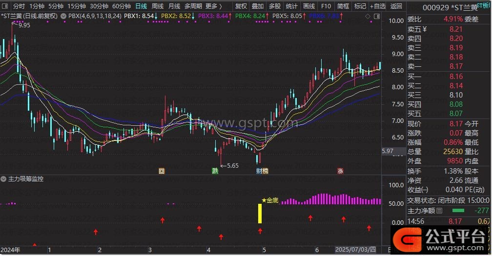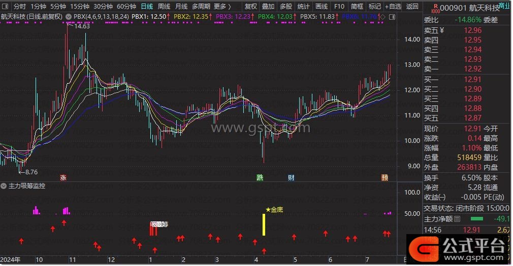 副图红色柱代表主力吸筹区域,紫色柱指示主力高控盘(控盘度大于50%),黄色宽柱标记金底共振买点,蓝色柱状显示筹码高度集中。