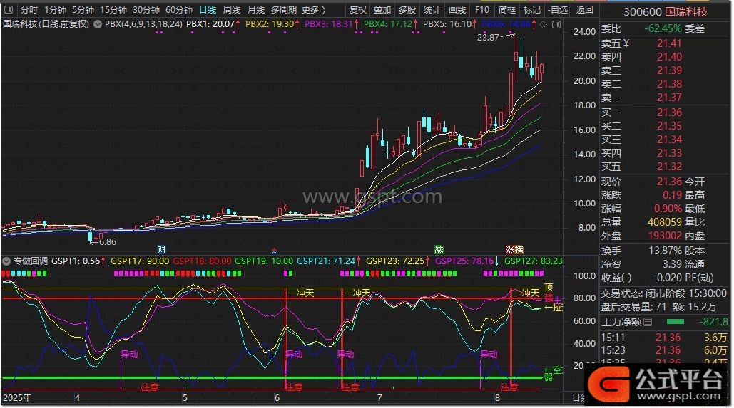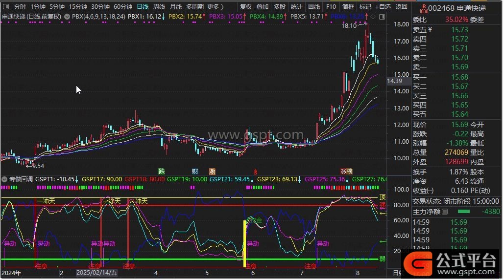 DRAWTEXT(gspt16>0 AND REF(gspt16,1)=0 AND (C+L)/2>MA((C+L)/2,8),30,'异动'),COLORMAGENTA;