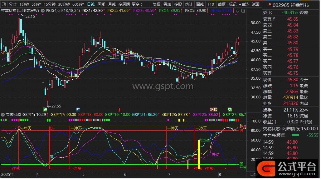 STICKLINE(gspt16>0 AND REF(gspt16,1)=0 AND (C+L)/2>MA((C+L)/2,8),0,25,0,0),COLORMAGENTA;