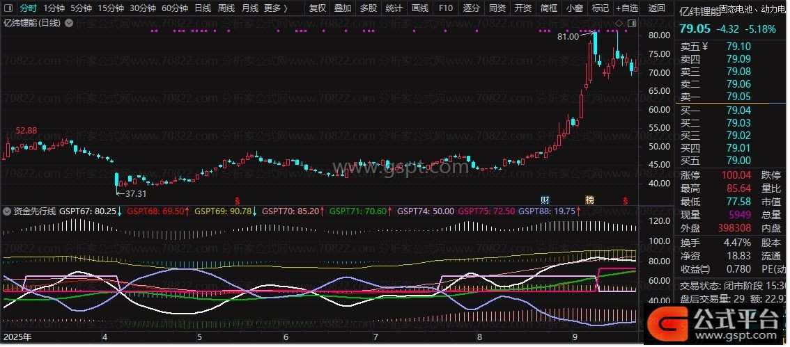 当红色个股资金线上穿另外两条线且三线呈多头排列时,可视为买入参考信号;当紫色大盘资金线率先走弱并下穿其他线时,需警惕市场整体转弱。指标还通过80/20超买超卖线和彩色柱状线提供明显的视觉信号。