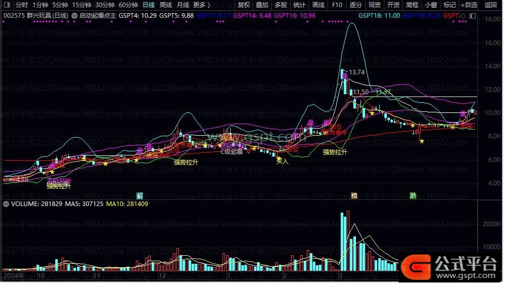 gspt9:=COUNT(CROSS(gspt6,0),3)>=1 AND gspt8>REF(gspt8,1) AND gspt5>REF(gspt5,1) AND (C/REF(C,1)-1)*100>5 AND REF(C,1)< gspt7;