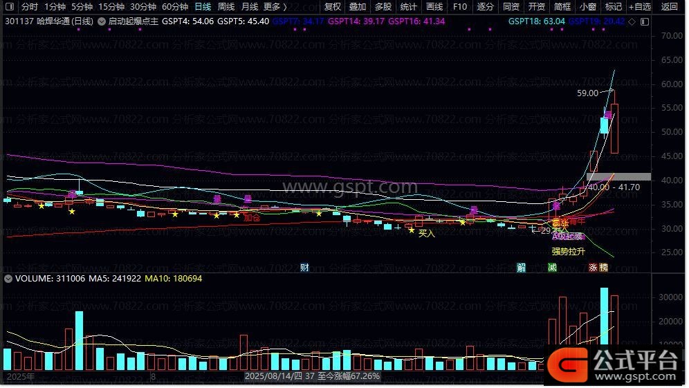 gspt30:=gspt28>=2*REF(gspt28,1) AND gspt29 AND ABS(gspt28)<=1 AND C>MA(C,20) AND C< MA(C,20)*1.2 ;