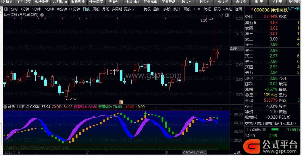 gsptC:=MA(CLOSE,3)*100/MA(CLOSE,10)-100;