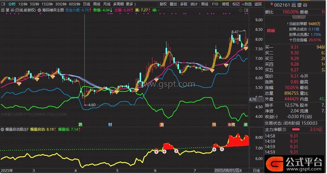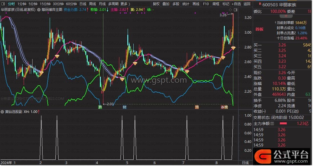该指标核心包含高低线与资金力度线、散筹线、主筹导线。散筹和主筹用于精准衡量成交量的买入与卖出力度。当散筹大于主筹,市场处于上涨趋势;主筹大于散筹,则市场处于回调或下跌行情。当主筹高于前一日且绿线上穿黄线,同时收盘价高于散筹线时,即发出选股买入信号。