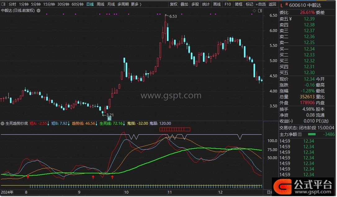 gspt34:=DMA(EMA(CLOSE,12),SUM(VOL,5)/3/CAPITAL);
