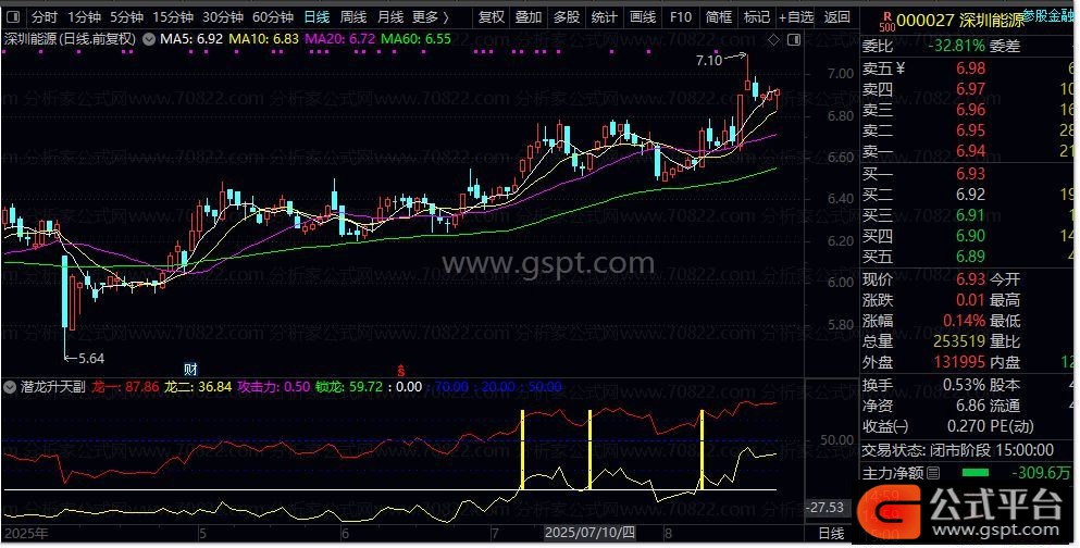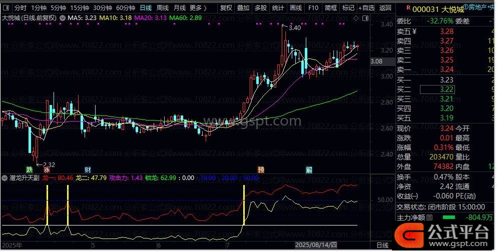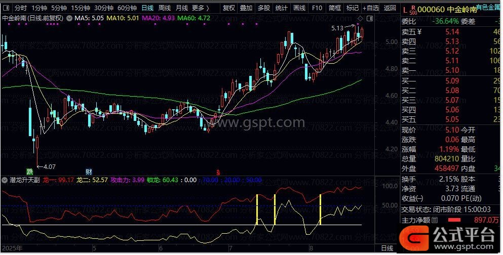 STICKLINE(龙二>0 AND C>gspt18 AND REF(龙二,1)<0,0,80,1,0),COLORYELLOW;