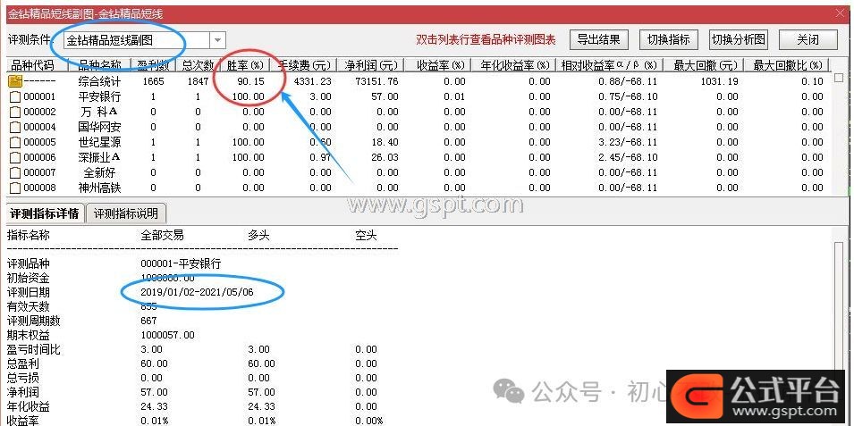 二、指标展示了短周期测试结果。在2019年1月1日至2021年5月6日的回测中,采用收盘价平仓规则测试持股3天,胜率约为90%(详见测评数据截图)。宝箱内容包含指标副图、选股器、DLL文件绑定安装方法及详细的使用说明文件。