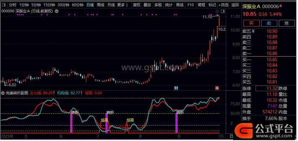 此外,公式结合成交量变化,定义多空条件,当条件触发时,图表显示彩色竖线和“转折”文字,提示买入机会;同时,“低吸”信号在机构线低于8时出现,标志低位布局区域。水平参考线(90、50、20、5)辅助判断超买超卖。