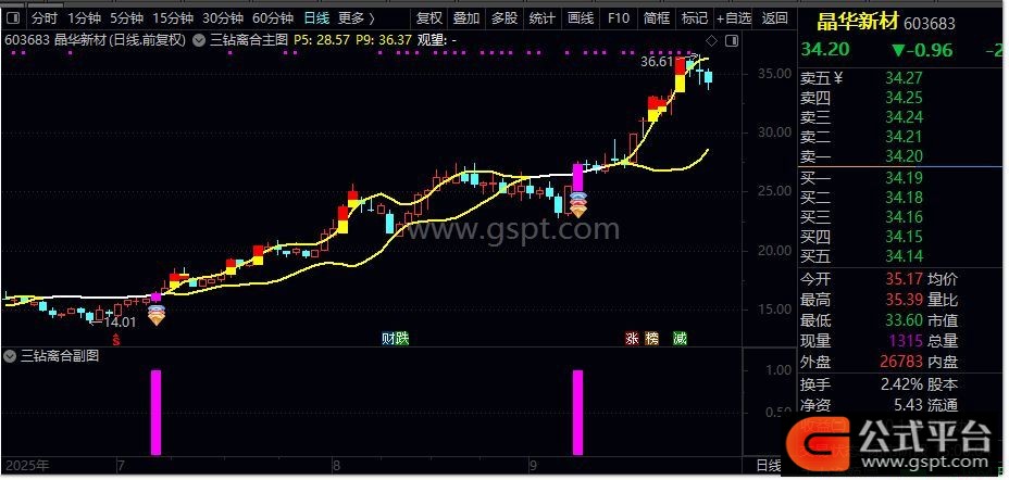 2. 趋势判断:股价在黄色轨道线(P5、P9)之间震荡时,白色"观望"线提示持仓机会;突破上轨则需警惕回调风险