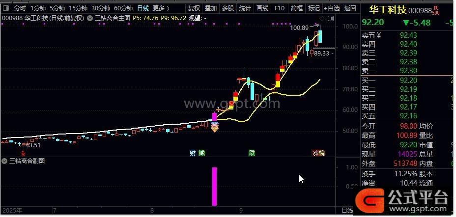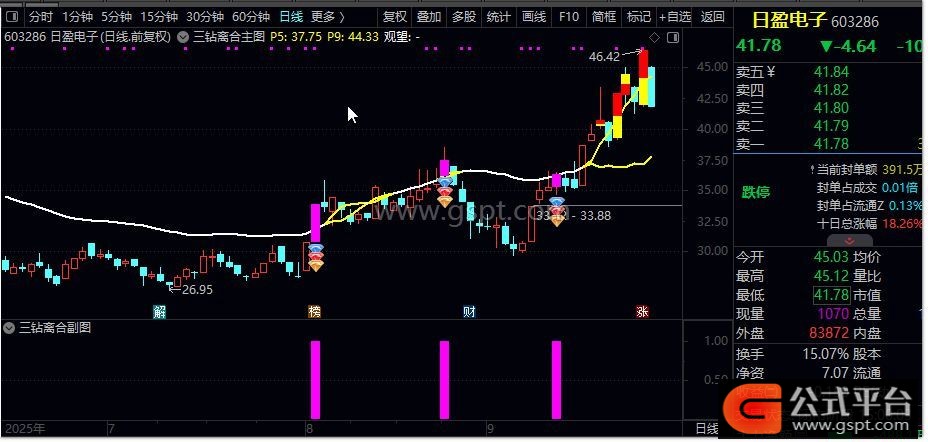 指标原理:该指标通过计算收盘价与成交量的加权平均值(P1),并推导出四条核心轨道线——上轨(P9)、下轨(P5)及动态中枢(P3)。当股价突破下轨并出现"三钻"图标时,表明多头力量开始主导市场。