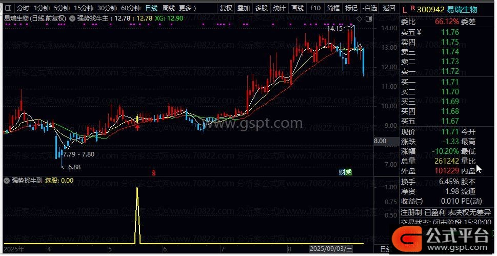 STICKLINE(强势底分=1 AND C>O,O,C,-1,0),COLORYELLOW;