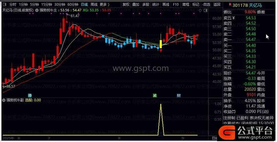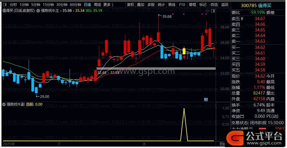 STICKLINE(强势底分=1 AND C>O,H,C,0,0),COLORYELLOW;