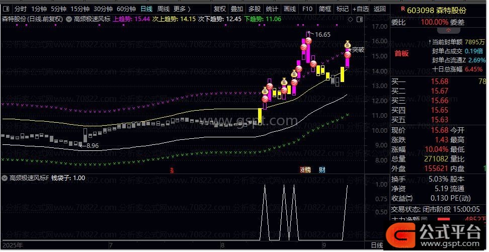 趋势强度达4级时,高位显示洋红色柱子,表示突破预警;首次出现4级时附钱袋子标志,视为启动信号。