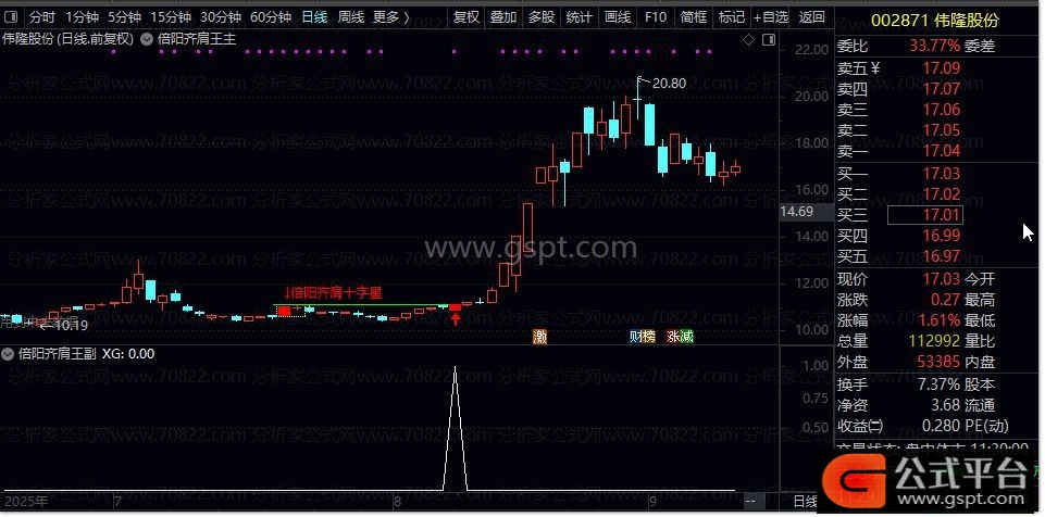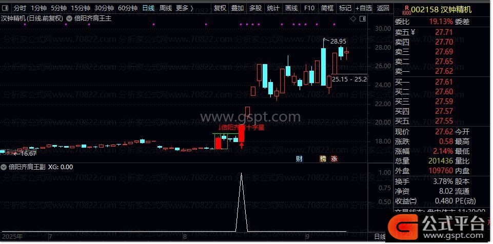 操盘精髓在于锁定龙头起涨点。当倍阳齐肩十字星形态显现,红色实体K线自动高亮,并以黄色虚线框标注;于K线组合最高点画出绿色水平实线,红色字体提示倍阳齐肩十字星。