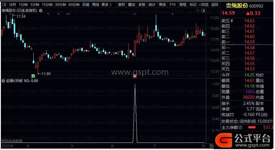 3.  起爆信号:当股价放量突破试盘阶段形成的高点,并伴随多种技术指标(如MACD、SKDJ、CCI)的多周期共振向好时,发出明确的起爆K信号。