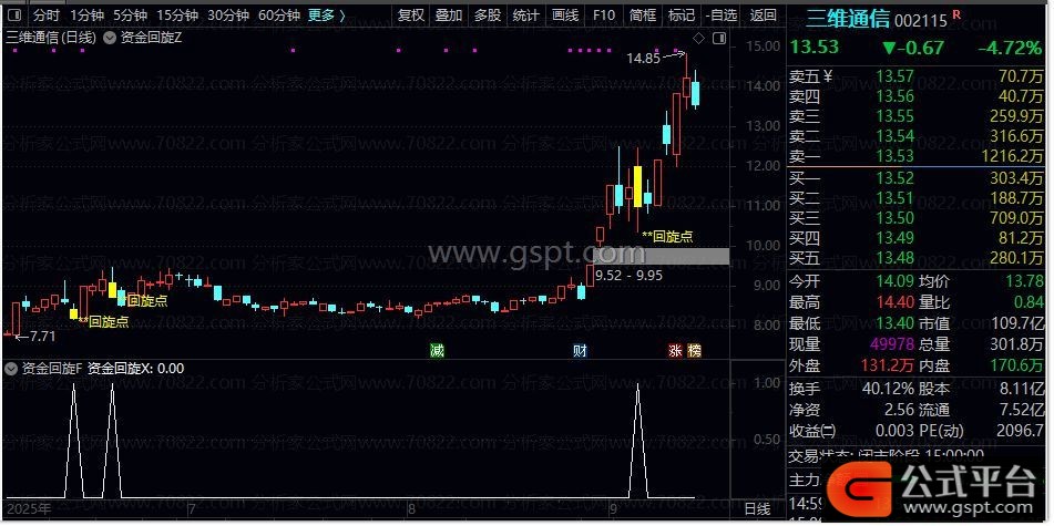1. 资金回旋指标识别强势形态中的阴阳双线,预示资金短暂回撤后再度入场,这常是第二波拉升与反弹的关键标志。