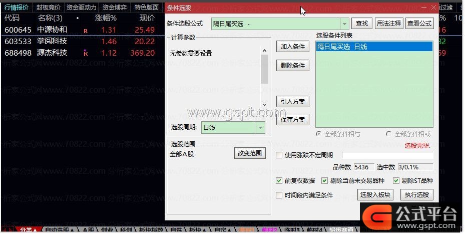 gspt3:=CLOSE>=gspt2-0.01 AND FINANCE(3)<>4 AND FINANCE(3)<>2 AND NOT(NAMELIKE('ST')) AND NOT(NAMELIKE('*ST'));