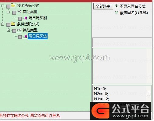 gspt2:=IF(FINANCE(3)=1,REF(CLOSE,1)*1.1,IF(NAMELIKE('ST') OR NAMELIKE('*ST'),REF(CLOSE,1)*1.05,0));