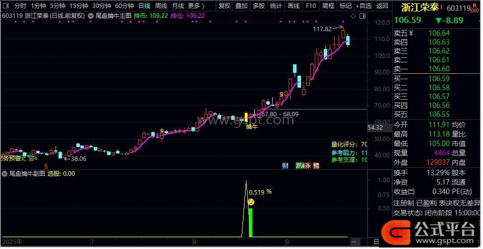 3 离场信号紧盯主图持币线 一旦持币线出现立即止盈 尾盘擒牛主副图选股指标助你精准尾买次日冲高。