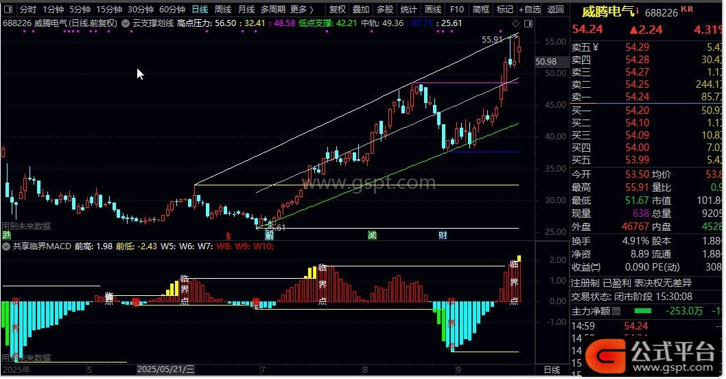 高点压力线:自动识别最近两个显著高点并连线形成压力线