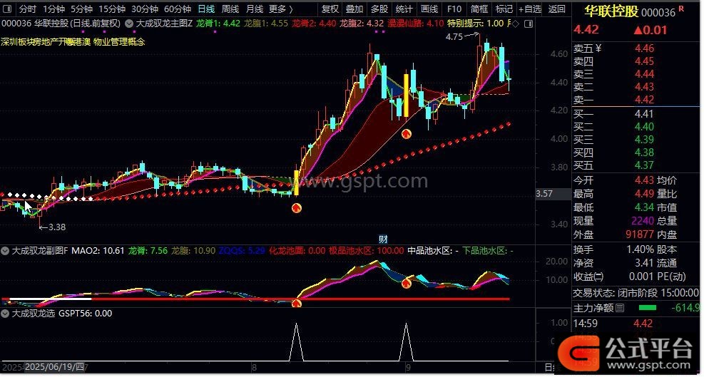 3、黄底红色向上箭头:为“大成驭龙”买入选股信号。