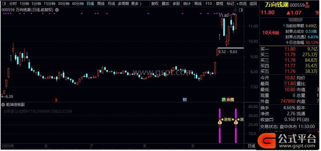 乾坤追板:=CROSS(C,REF(C,gspt32)) AND gspt30 AND NOT(DYNAINFO(4)=0);
