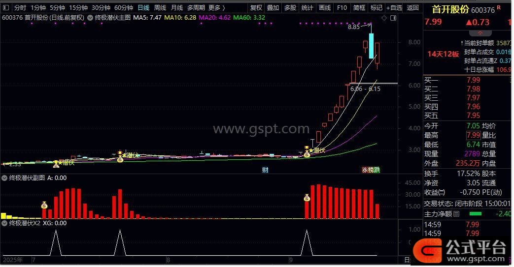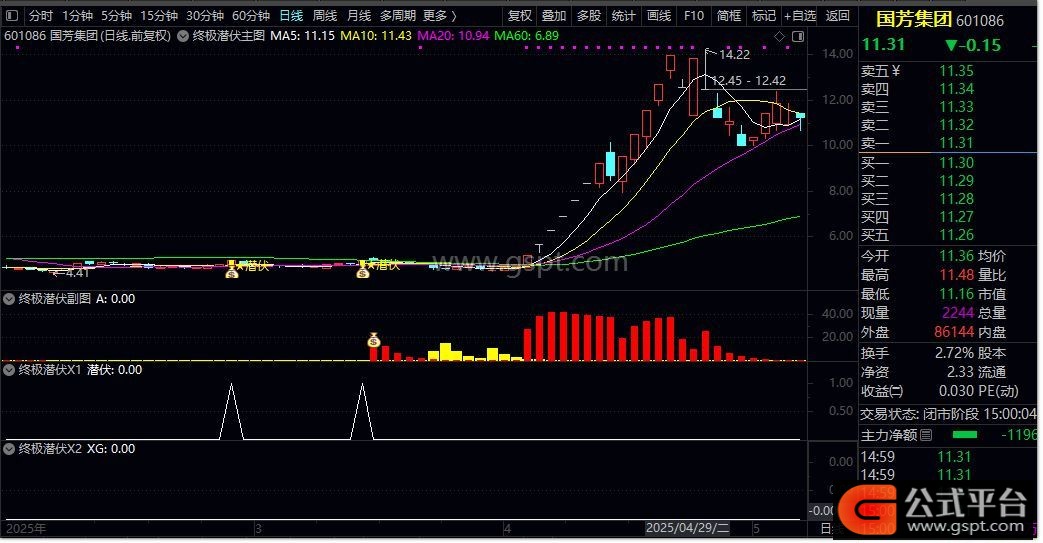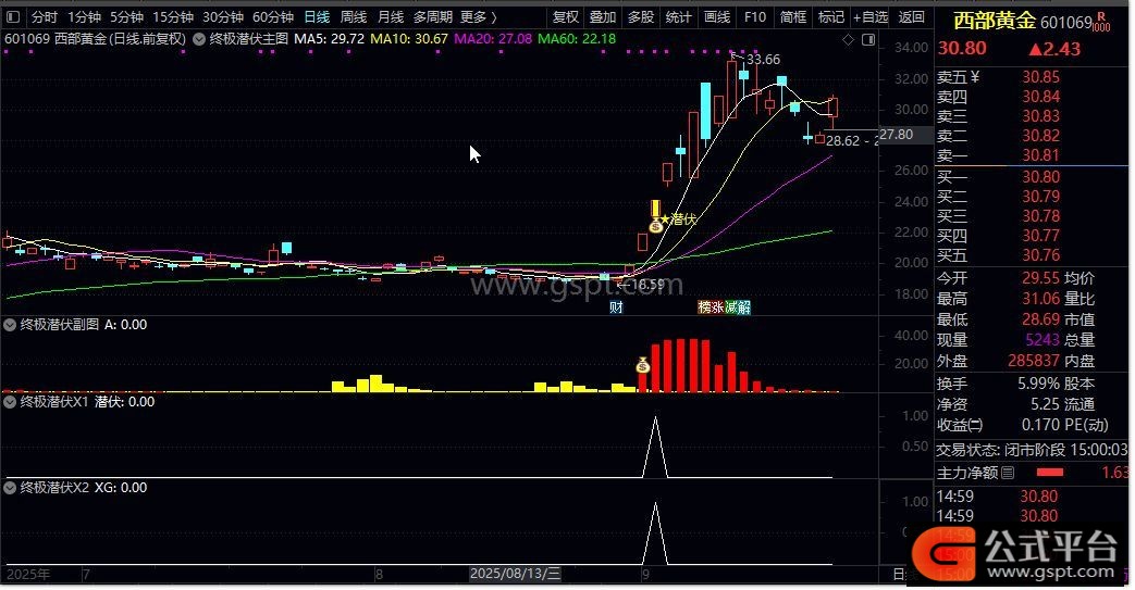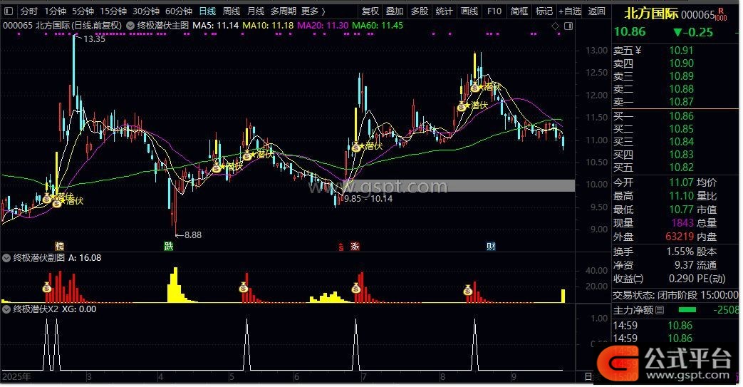 "终极潜伏副图"则通过量化价格波动强度,动态监测超买超卖状态。当黄色柱状线出现且伴随红色能量柱放大时,表明资金活跃度提升,与主图信号形成共振。