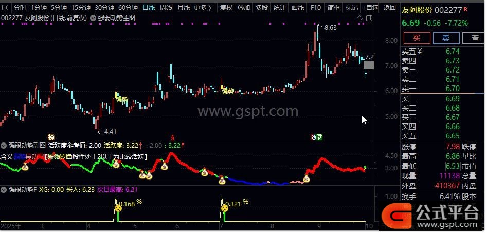 • 强势信号(黄色K线+文字标注):当XG条件触发时,主图显示黄色K线并标注“强势”。此时需满足趋势向上、活跃度达标、连续收阳且未涨停,是波段介入的重要参考点。