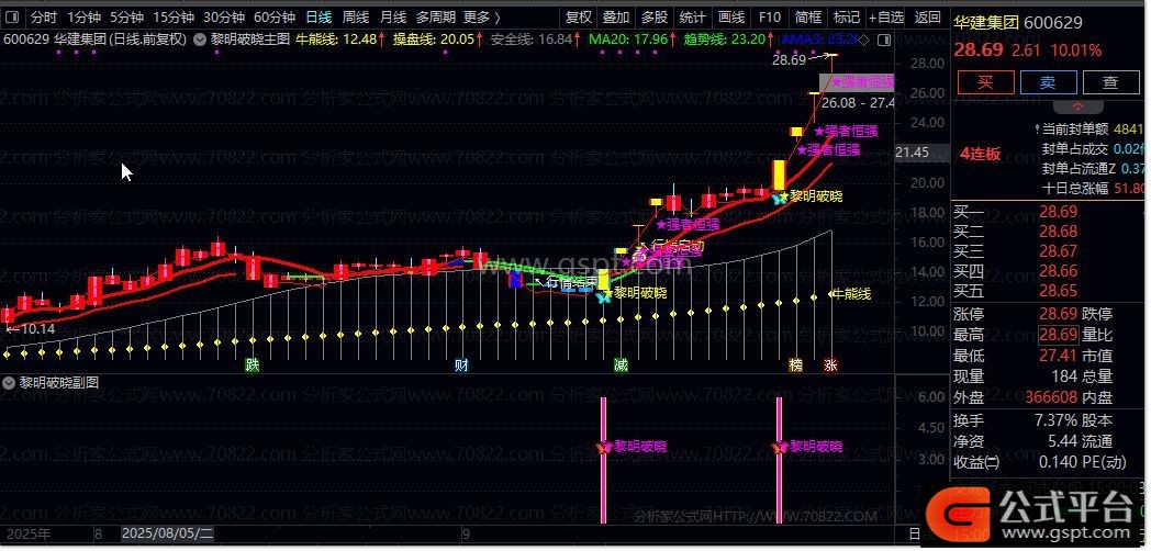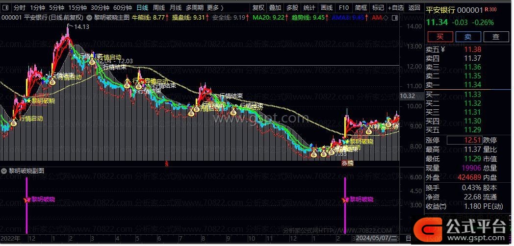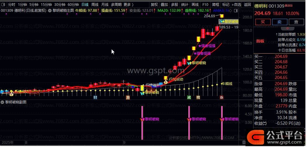 该指标巧妙融合价格、成交量与成本分布分析。它通过牛熊线判断长期趋势方向,利用操盘线和安全线构成中期支撑压力体系,再结合短期趋势线与20日均线的交叉关系捕捉短期买卖信号。最独特的是其成本算法,通过分析筹码分布状况识别主力资金动向,在启动点标注“★黎明破晓”提示信号。