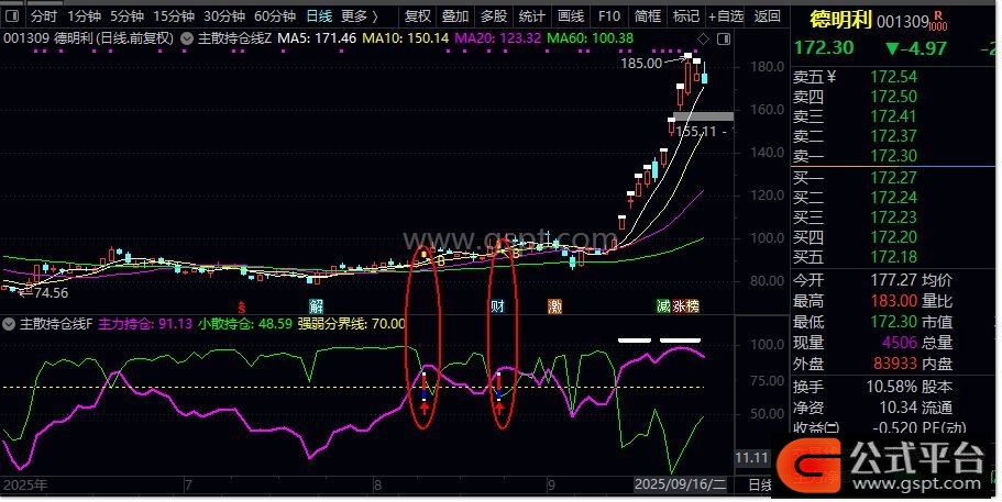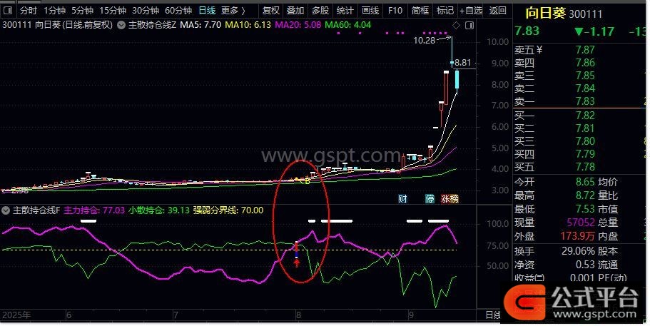 主图黄色K线配合“B”点信号,以及副图红色箭头,共同构成进场信号。选股指标专门捕捉此位置:要求绿色散户线与紫色主力线形成金叉,且此前至少有五个交易日散户线持续位于主力线上方。这种形态代表弱势后的首次走强,是重要的趋势转折信号。