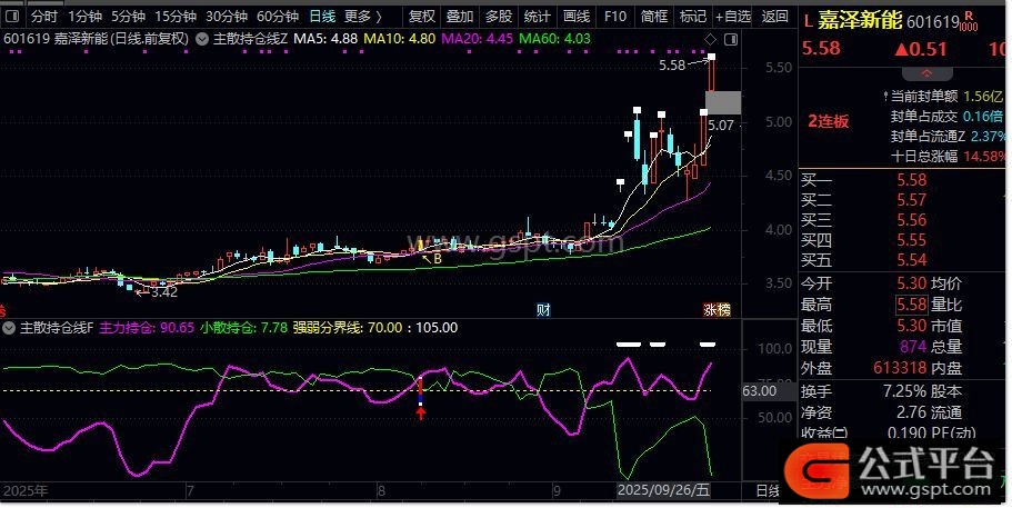 副图指标中,绿色曲线代表小散持仓线,直观反映散户筹码的堆积趋势;紫色曲线为主力持仓线,清晰展示主力筹码堆积轨迹。黄色水平虚线设定于数值70位置,作为多空分界线。无论主力线或散户线,运行于黄线上方表明对应方趋势强劲,下方则趋势偏弱。