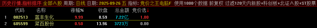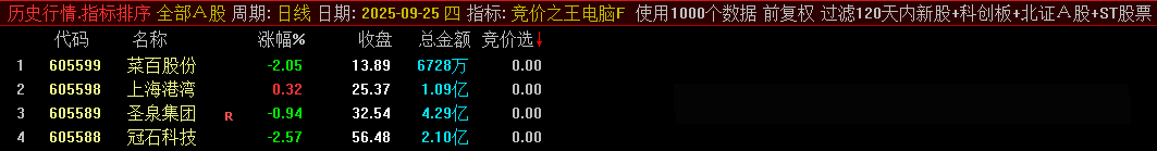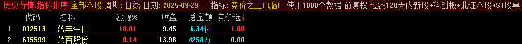 指标使用说明:竞价之王集合竞价排序选股指标。集合竞价抓涨停指标。正常每天1-2个信号,上周出信号全胜,当天涨停100%。指标有电脑版和手机版。手机版无排序功能,在9点25分至9点30分之间执行选股即可。电脑版副图指标可用做排序,每天需在开盘前下载日线和专业财务数据,在9点25分至9点30分之间排序选股。