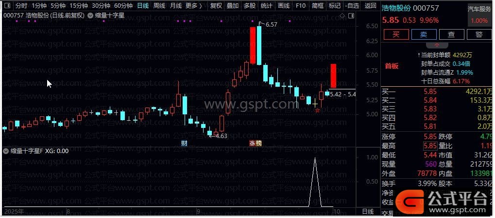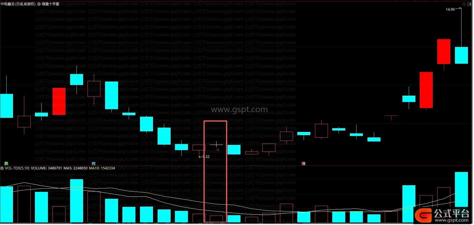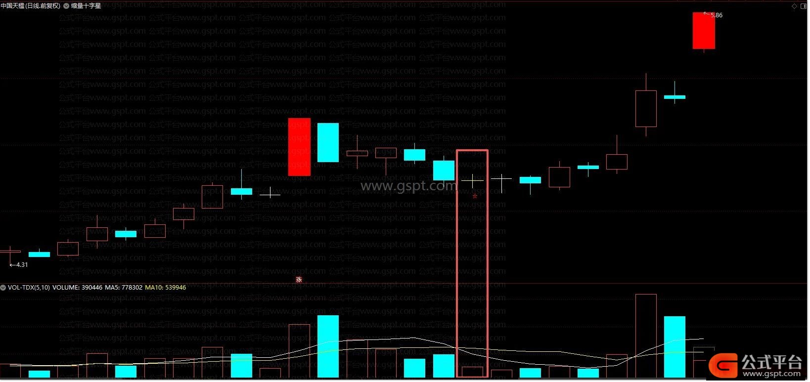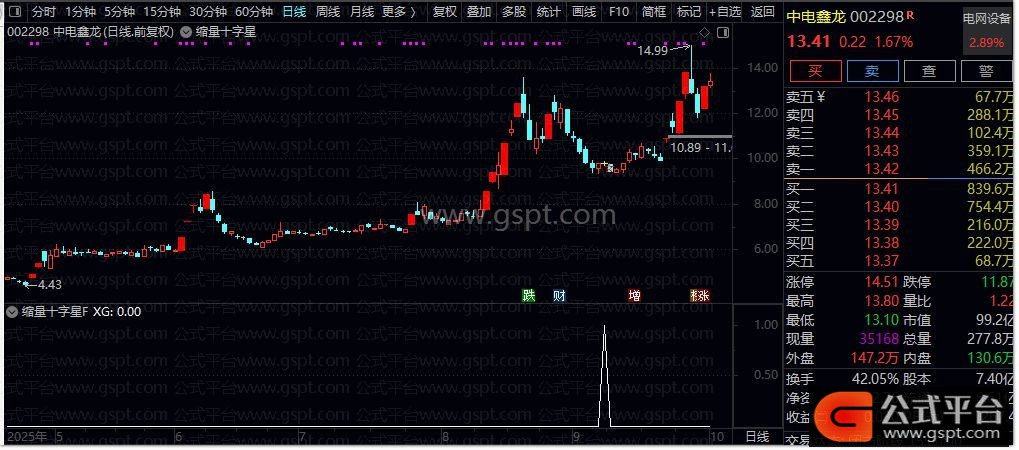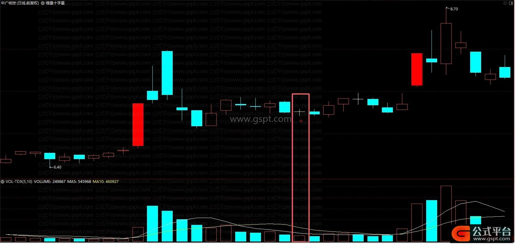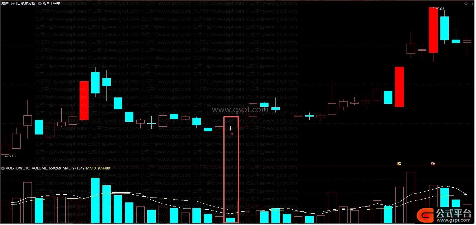 当系统检测到以上条件全部满足时,为了提供直观的视觉信号,主图会显示黄色十字星且下方有红色五角星。这个红色五角星位置就是选股指标要选出的标的,提示用户重点关注。
