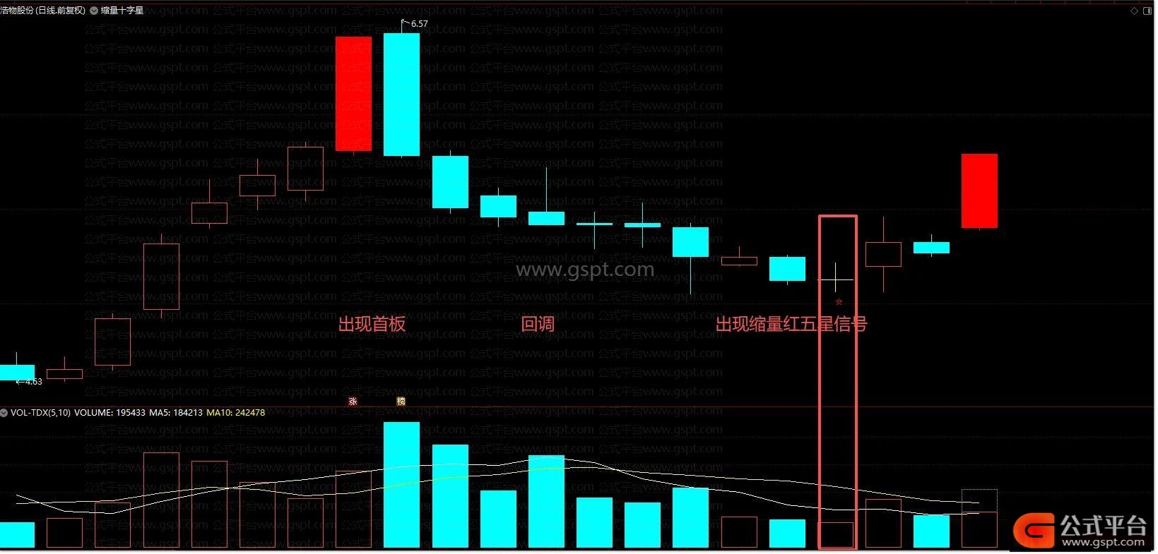 编写公式的思路基于一个核心市场现象:当股票出现首个实体涨停板后,如果股价逐步回调且成交量持续萎缩,直至出现极度缩量的十字星K线,这往往预示着下跌动能衰竭和潜在的趋势反转点。本指标通过量化这一系列形态,帮助投资者识别关键的低吸时机。