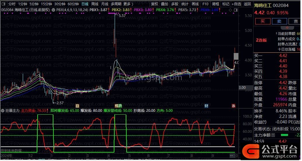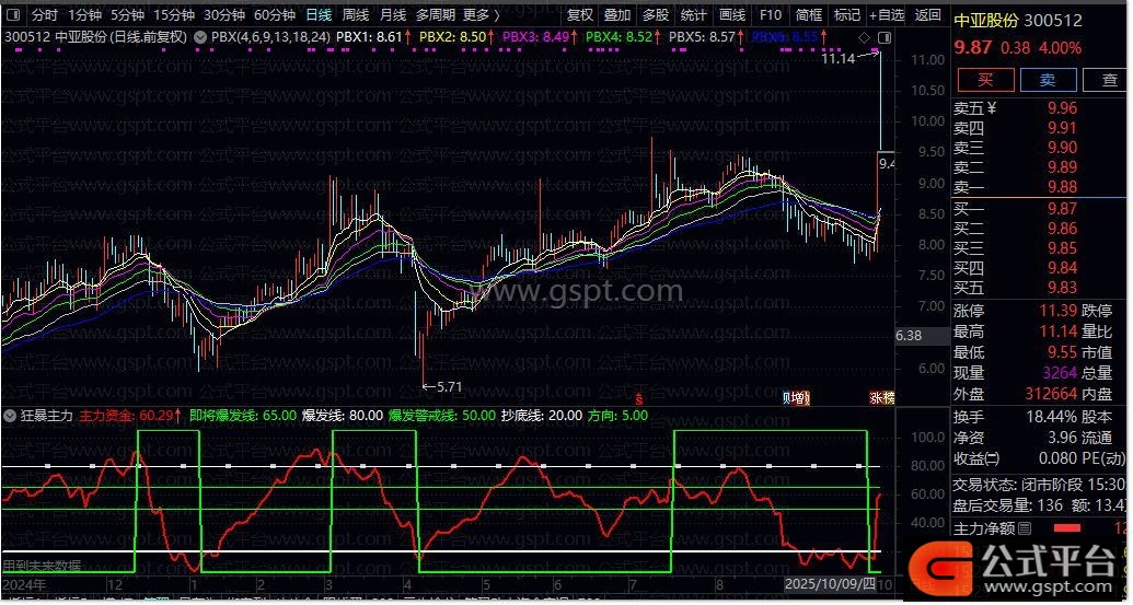 方向:IF((峰值> REF(峰值,1)),5,105),COLOR00FF00,LINETHICK2;
