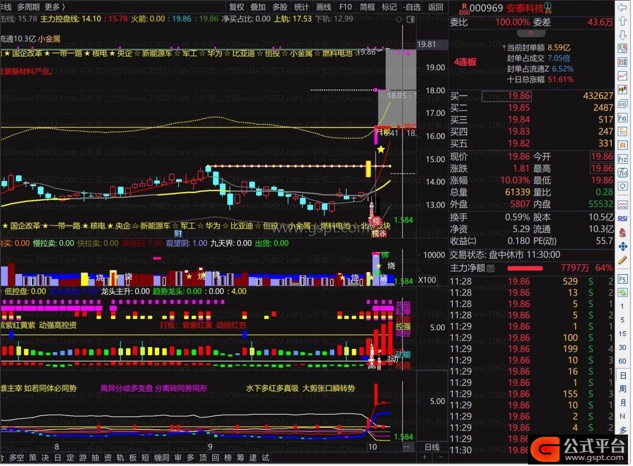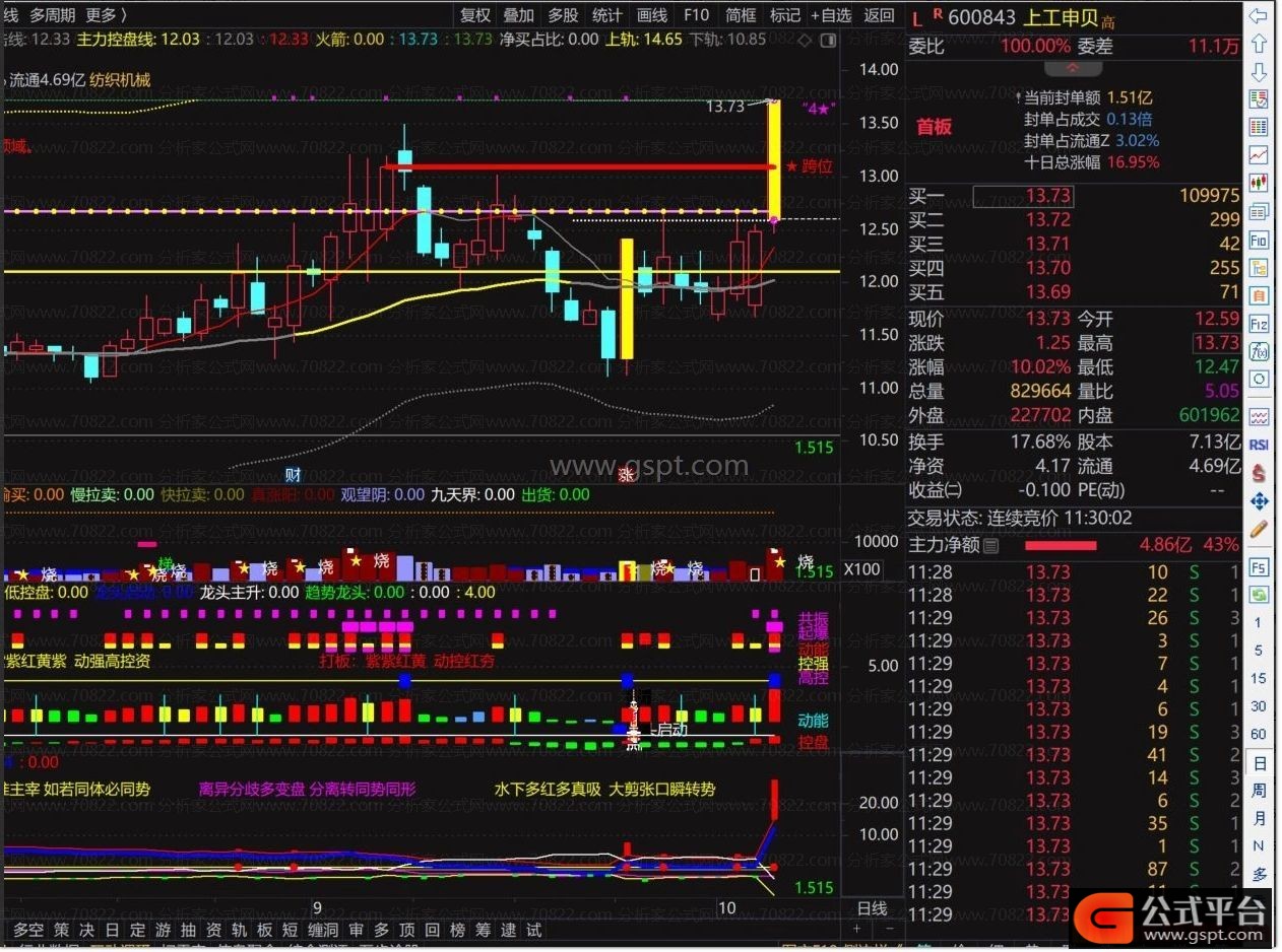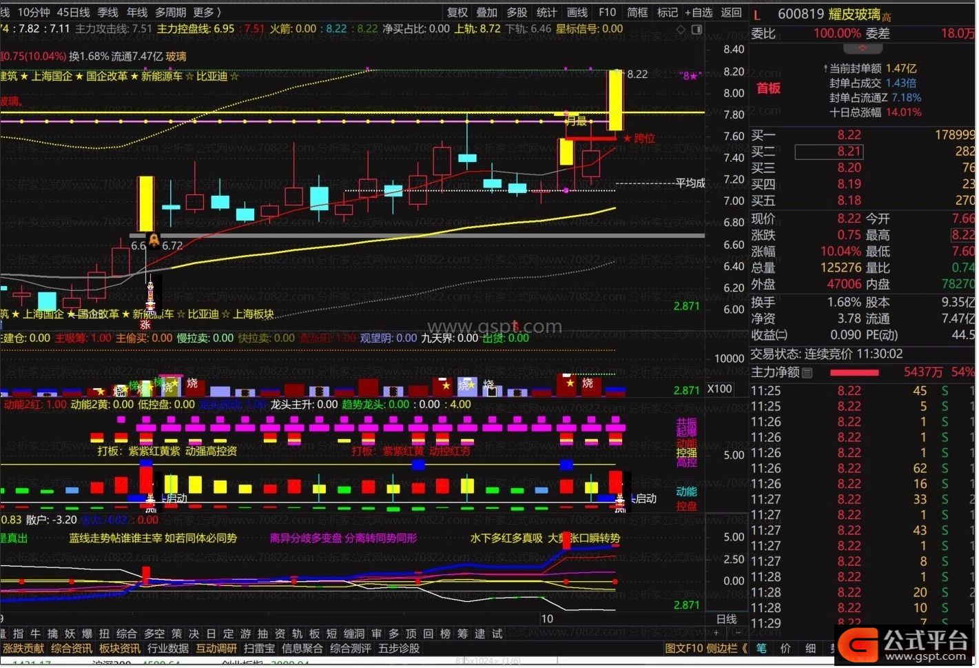首板盘中即可出“紫紫红黄紫”信号,配合系统指标长期资金博弈指标即可大胆盘中买入,次日大概率吃肉。