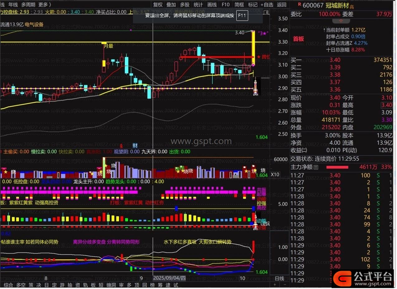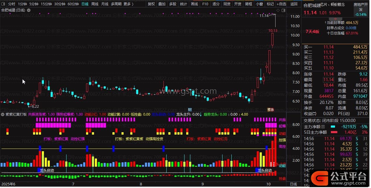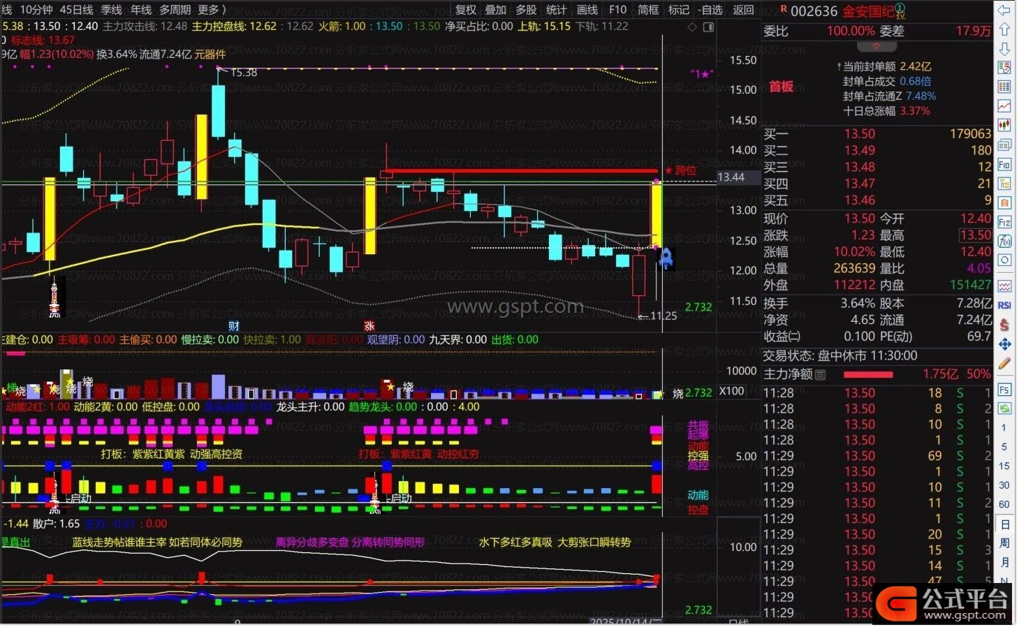 首板盘中即可出“紫紫红黄紫”信号,配合系统指标长期资金博弈指标即可大胆盘中买入,次日大概率吃肉。