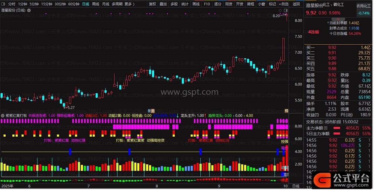 首板可以不出“紫紫红黄紫”信号,但二板在9点25即可出现“紫紫红黄紫”信号,配合长期博弈资金指标果断出手,轻松收获2个涨停