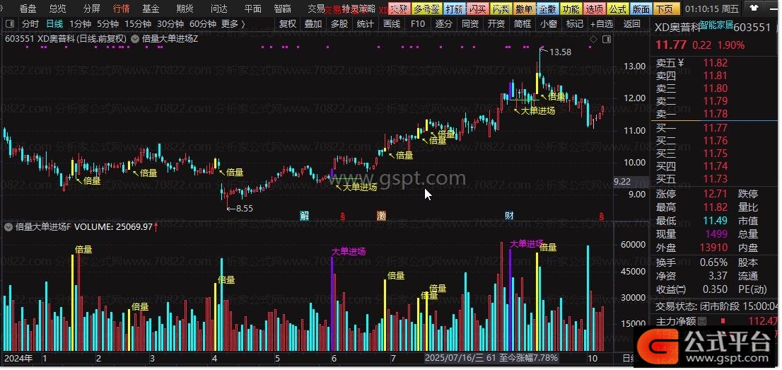 2. 选股信号主要聚焦于大单进场信号。在实际操作中,建议将倍量信号与大单进场信号共同使用。通常,倍量信号可作为趋势启动的第一进场点,而后续确认的大单进场信号则可作为加强信号的第二进场点,两者结合提高操作成功率。