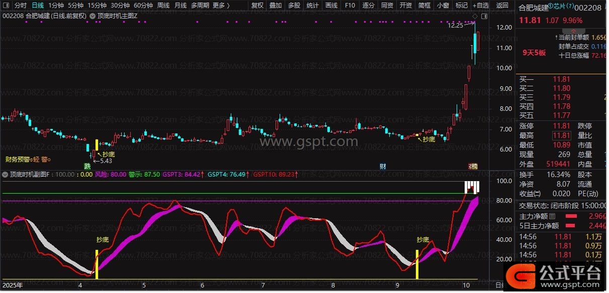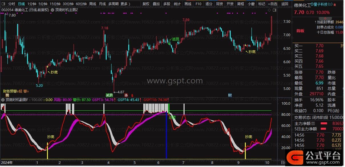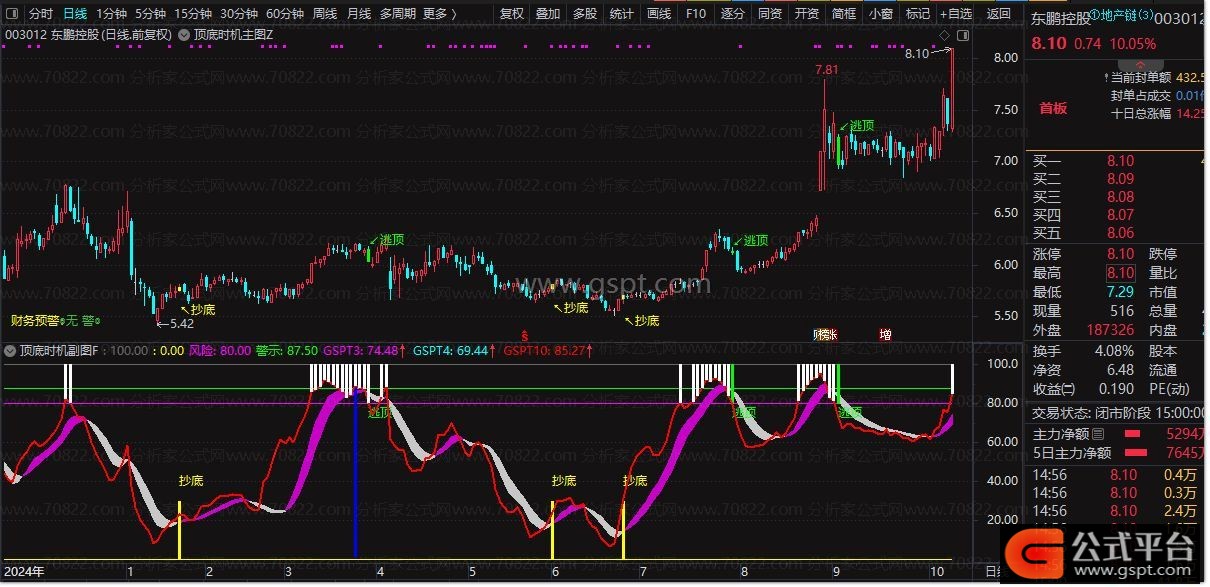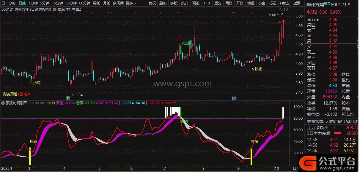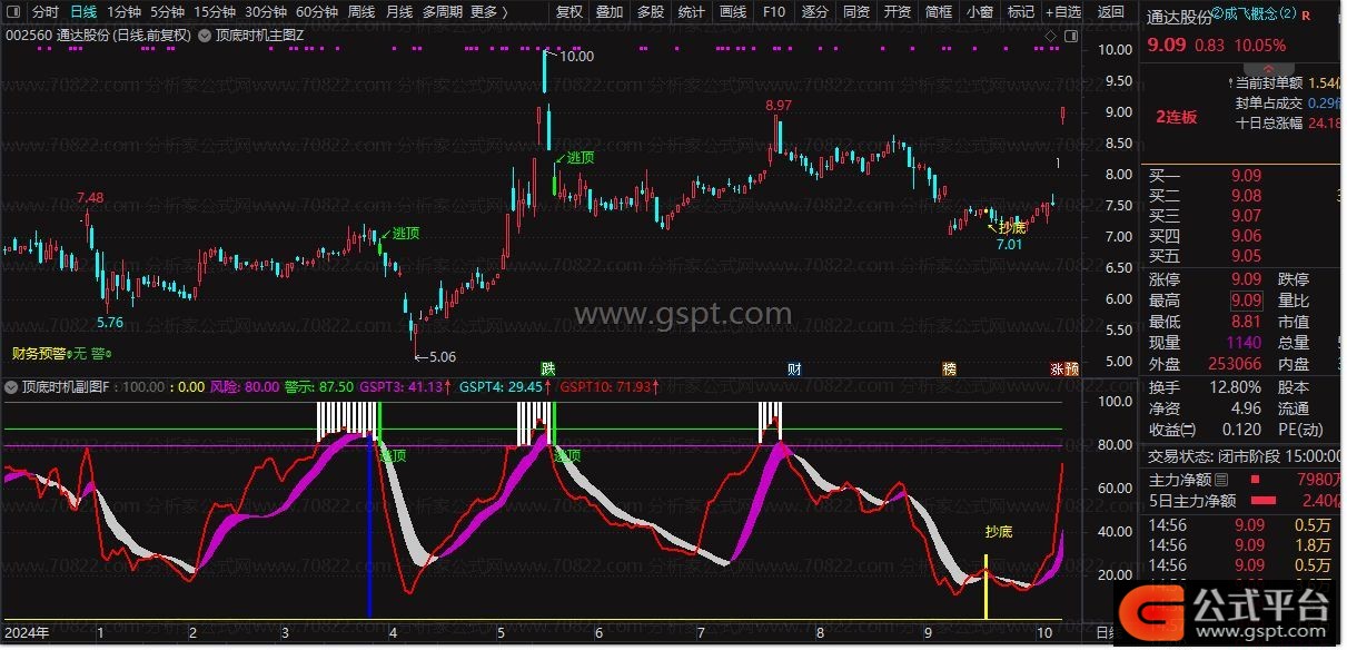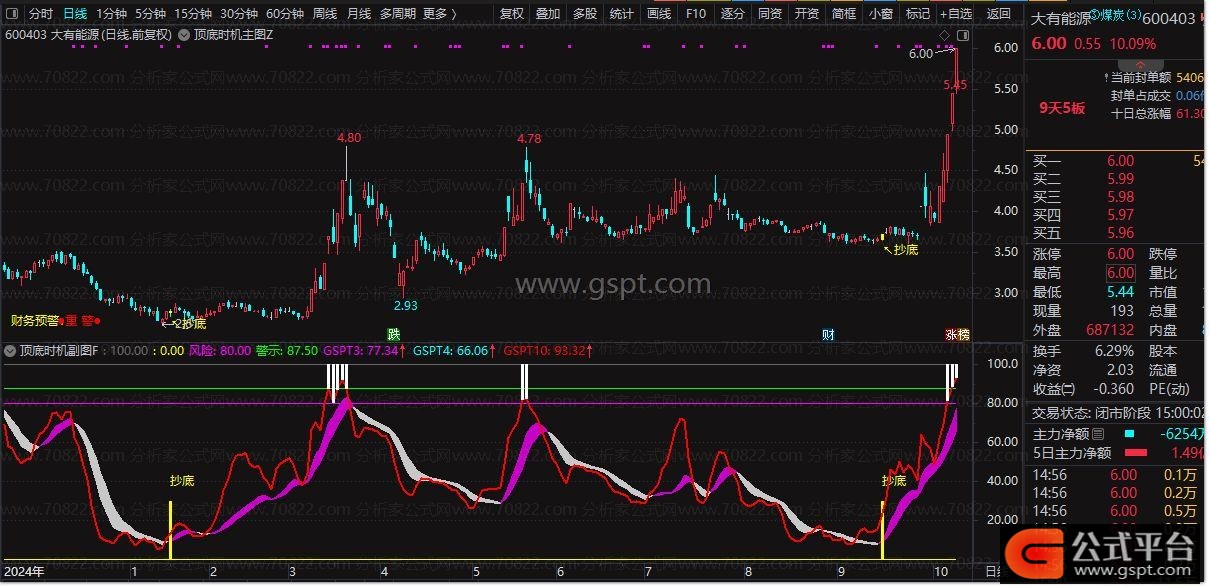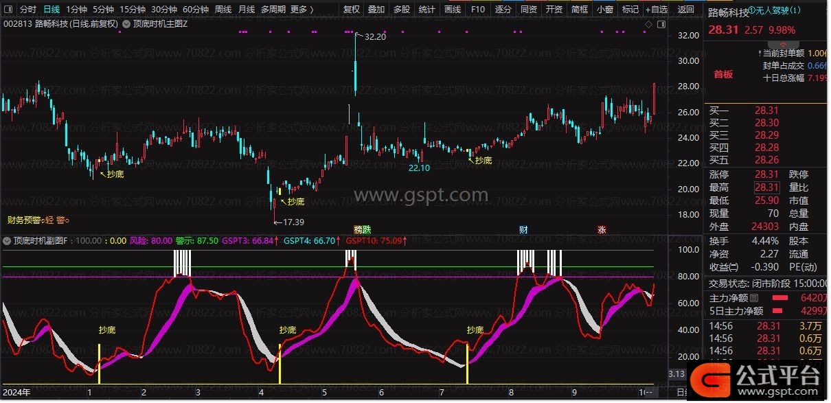 • 高级逃顶:绿色柱状线配合“逃顶”文字标识,明确主力出货信号。