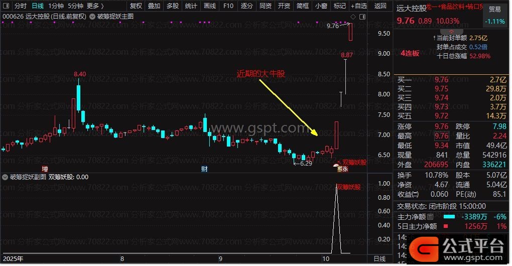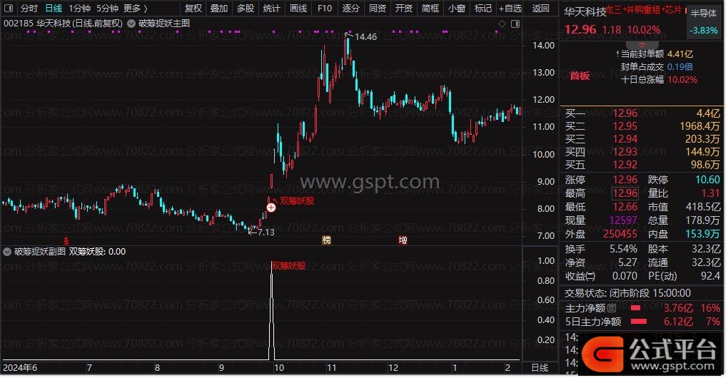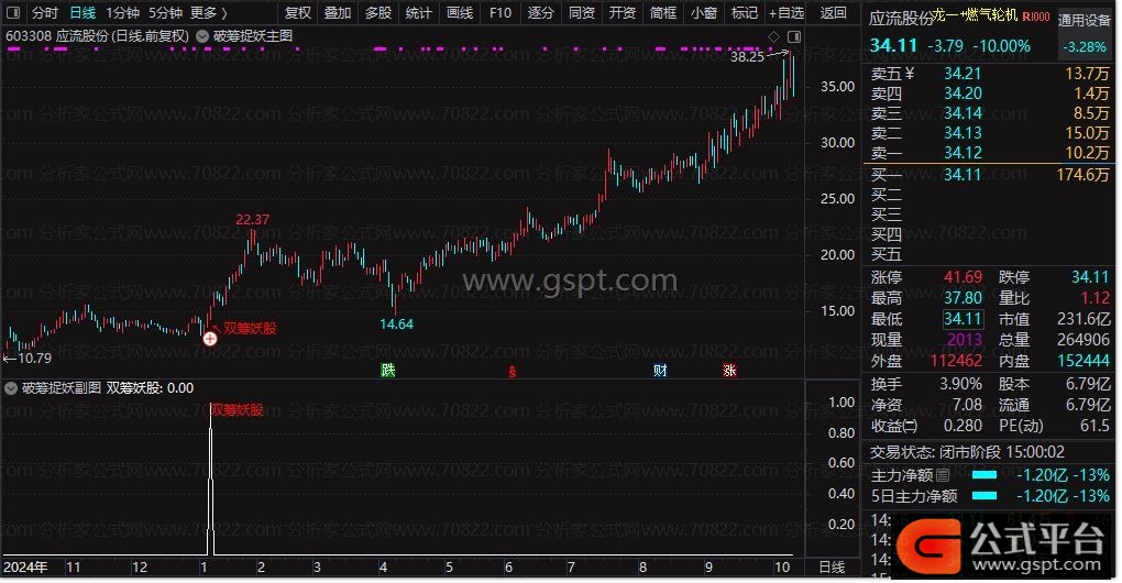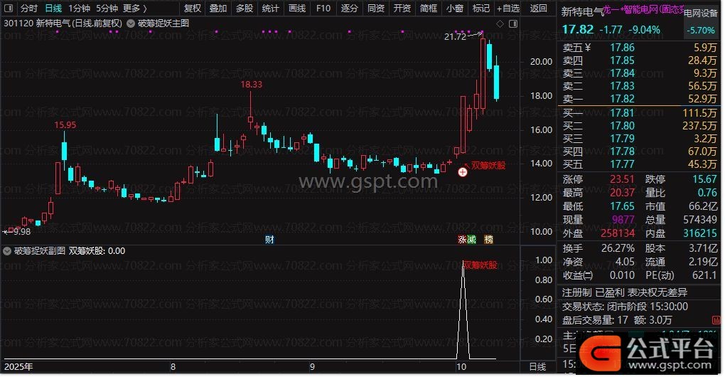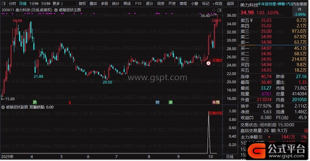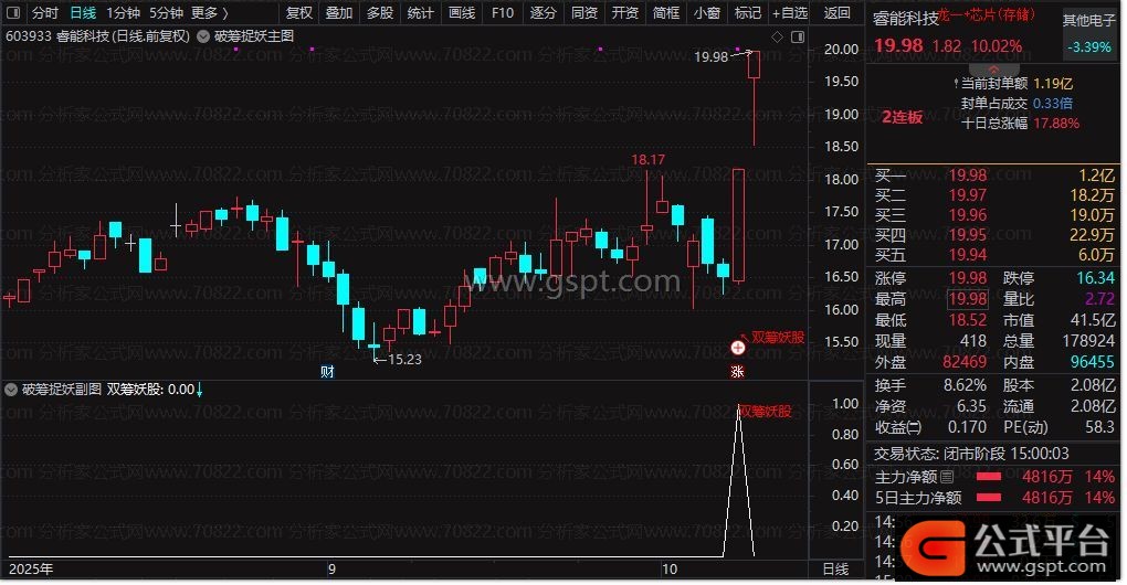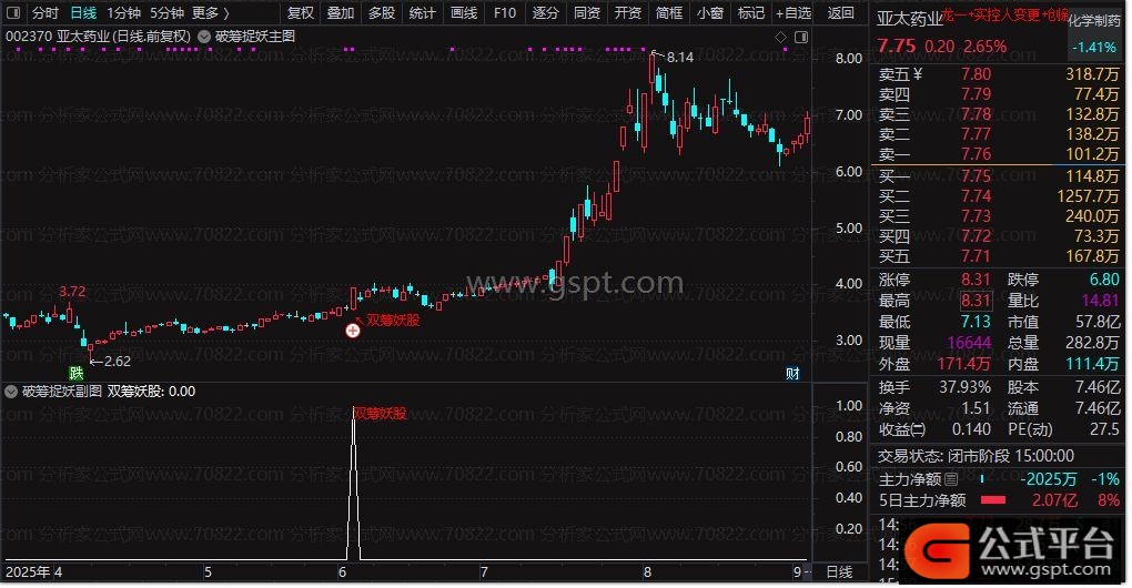 当“双筹”信号与“妖股”信号同时出现时,指标会在K线图的相应位置绘制一个鲜明的图标(如23号图标)并标注“↖双筹妖股”的文字提示,非常直观。